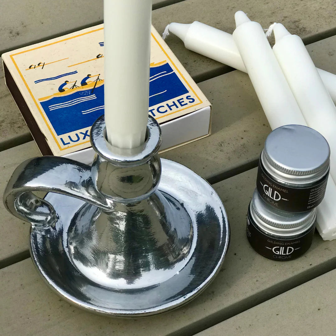 SILVER CHROME metallic enamel paint delivers a stunning mirror-like finish with uncompromising pigment quality and exceptional shine. This innovative formula features remarkable fluidity that applies effortlessly, self-levelling to create a flawless, reflective surface reminiscent of liquid silver. The ultra-smooth coverage requires no topcoat, thanks to built-in protective properties that resist tarnishing. Ideal for gilding frames, detailing furniture and hard