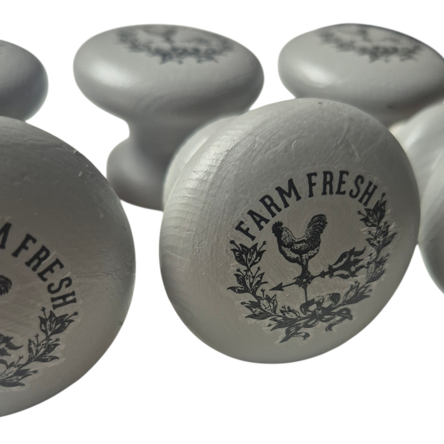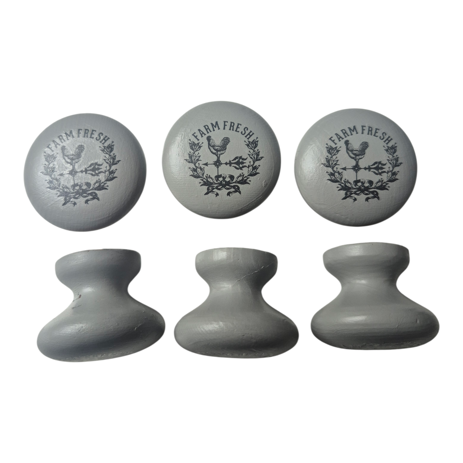 These painted wooden drawer knobs exude a farmhouse charm. Painted with Fusion Mineral Paint and adorned with 'FARM FRESH' transfers , these knobs are perfect for a country cottage.